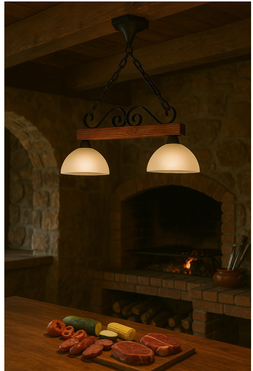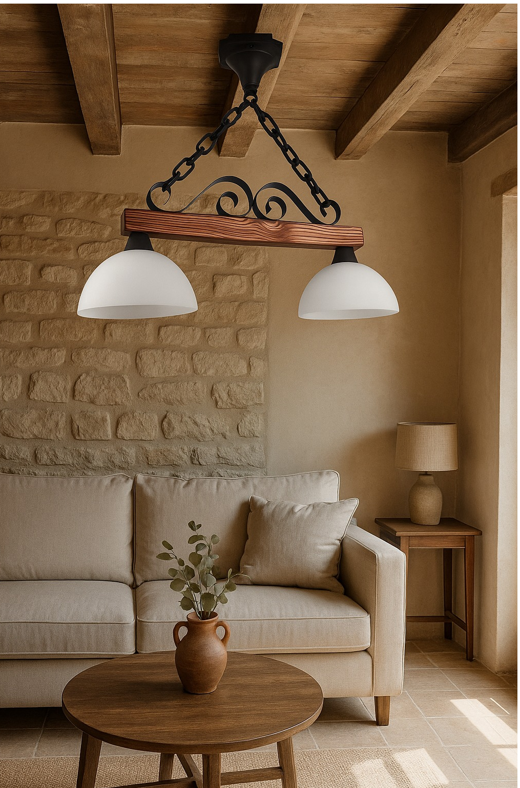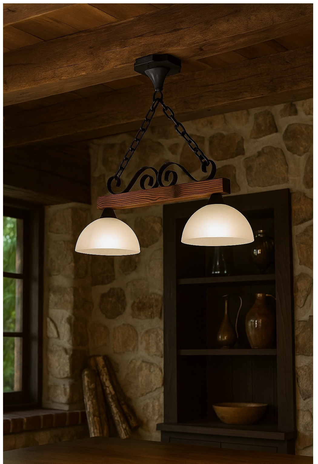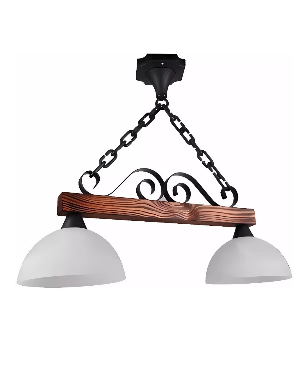 Colgante Rustico Hierro Y Madera Con Campanas Vidrio Blanco