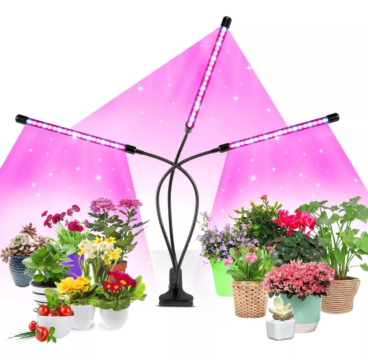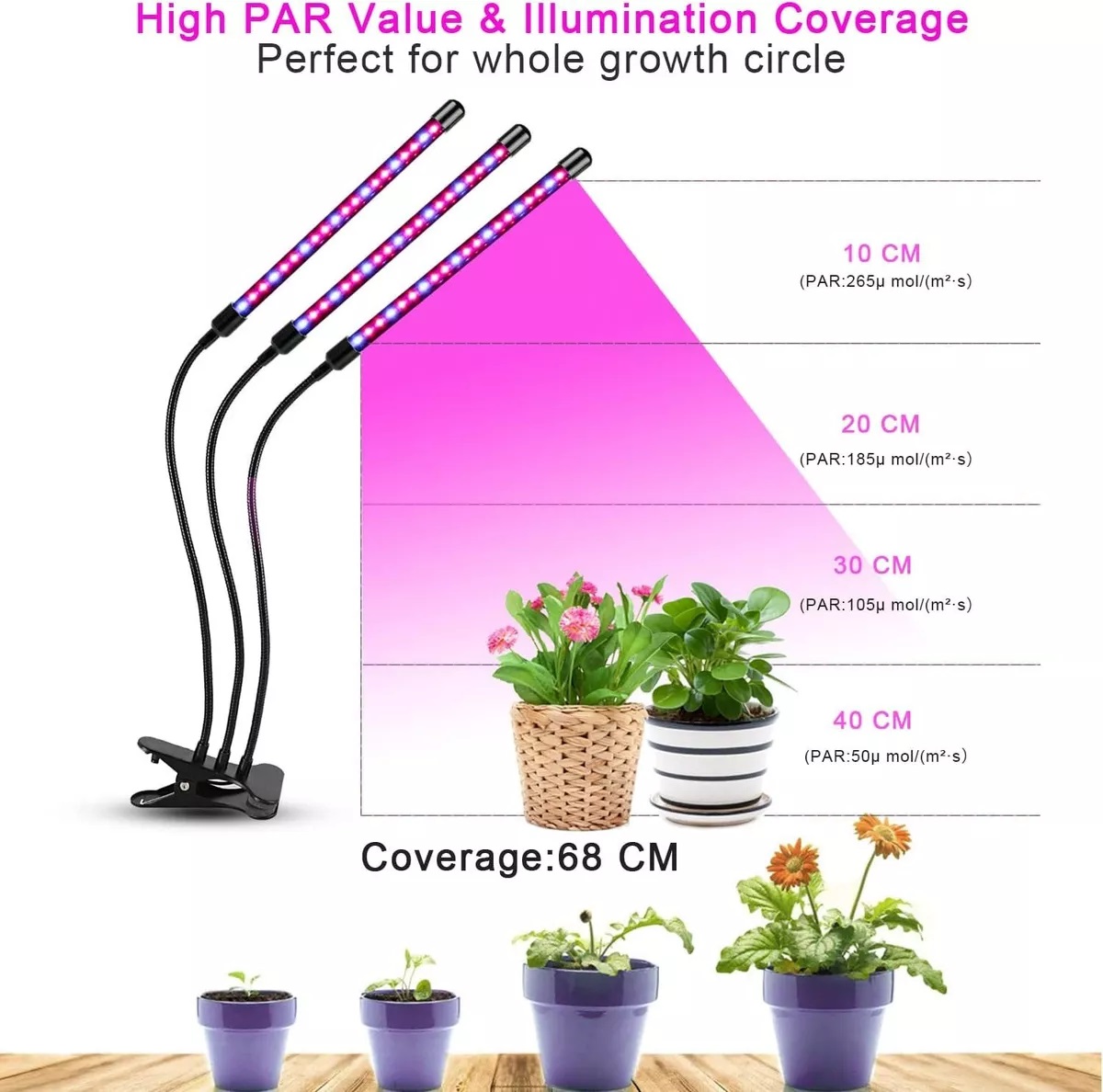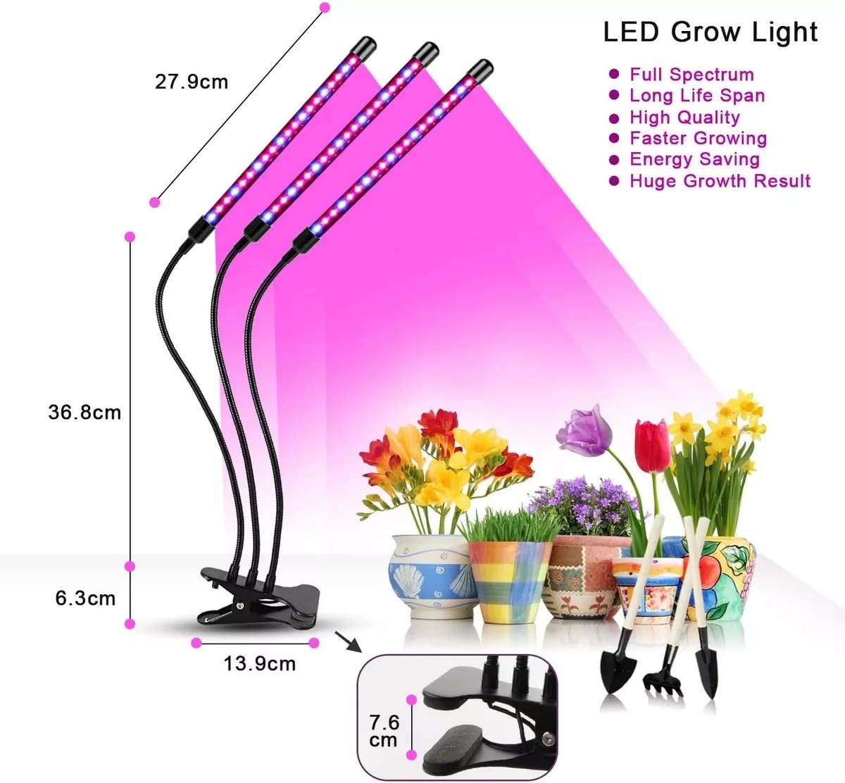 Las luces de crecimiento están diseñadas con 3 cabezas y cuello de cisne flexible de 360 grados con clip. No solo resuelve la inflexibilidad y las molestias de las luces colgantes tradicionales de cultivo de plantas, sino que también proporciona una mayor cobertura que las luces de crecimiento con dos o tres brazos. Es mucho más fácil ajustar el ángulo y la distancia entre la luz y las plantas.